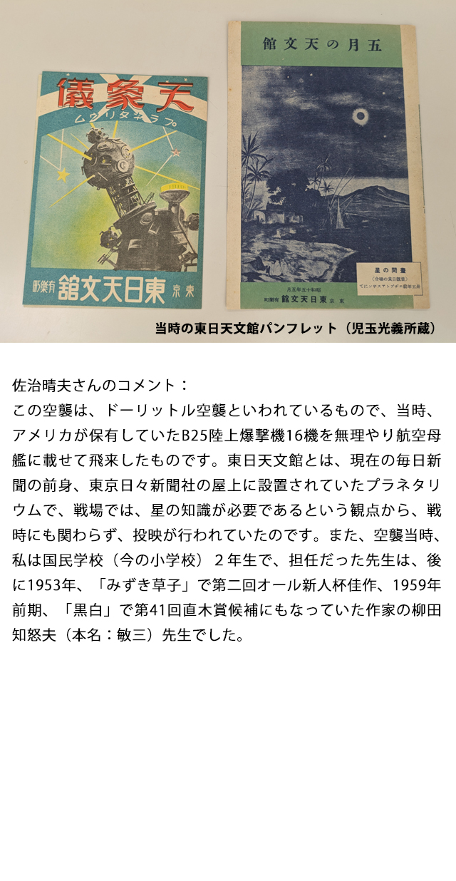 太平洋戦争開戦からわずか4ケ月後の1942年4月18日(土)の昼過ぎ、友人と下校途中の私たちの頭上に覆いかぶさるかのように見慣れない双尾翼の飛行機が超低空で飛来、近隣の森の中から高射砲射撃が始まりました。驚いて家に駆け込んだ時に空襲警報のサイレンが鳴りました。今から83年前(2025年掲載時点)のことです。これは前年12月8日(現地時間7日)、日本軍による真珠湾奇襲攻撃への報復と日本国民への戦意喪失を狙ったアメリカ空軍による日本本土への決死の初空襲でした。その翌週、朝礼の後、担任の先生が言われたのです。「今週の土曜日に、君たちを連れていきたいところがある」その行き先が、当時日本には2基しかなかったプラネタリウムの1基が設置されていた有楽町の東日天文館でした。トロイメライの美しい調べとともに、暮れていく空に輝く星の世界に圧倒されました。戦時にもかかわらず、授業のはじめには宮澤賢治の作品の読み聞かせをしておられた先生は、万人に対して最も公平な存在が星であり、星に親しむことこそが、平和を築く礎石になると思っておられたのではないかと今では推測しています。後に物理学を専攻し、宇宙創生の謎に挑むきっかけとなった忘れ難い出来事でした。