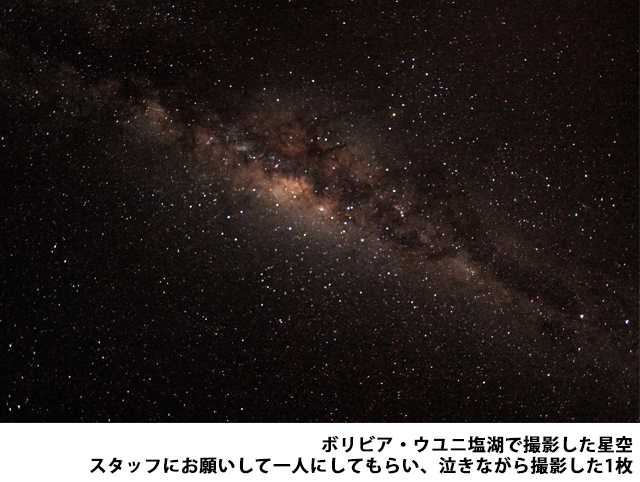 ALMA電波望遠鏡での撮影を終えた翌日、隣国ボリビアのウユニ塩湖へ。その夜に目にした星空は、想像をはるかに超える光景でした。それまで星空は見上げるものと思っていましたが、そこでは地平線から天の川銀河がせり上がり、見渡す限りの星々が広がっていました。あまりに圧倒的な星空に畏怖の念を覚え、心が震え、涙が止まりませんでした。