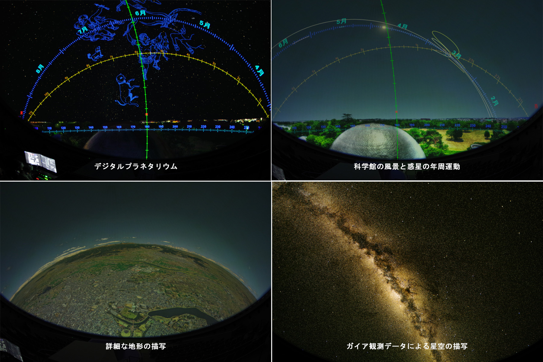 全天周デジタル投映システム「バーチャリウムⅡ」は、4K解像度のビデオプロジェクター2台を使用し、直径23mの傾斜型ドームスクリーンに、つなぎ目のない美しい全天周映像を投映します。地球から見た星空の描写に加え、宇宙空間から俯瞰した地球の詳細な地形表現や、最新の宇宙研究成果を反映した映像表現が可能で、欧州宇宙機関(ESA)が公開した位置天文観測衛星「ガイア(Gaia)」による最新の観測データに基づく星空の再現が可能となりました。