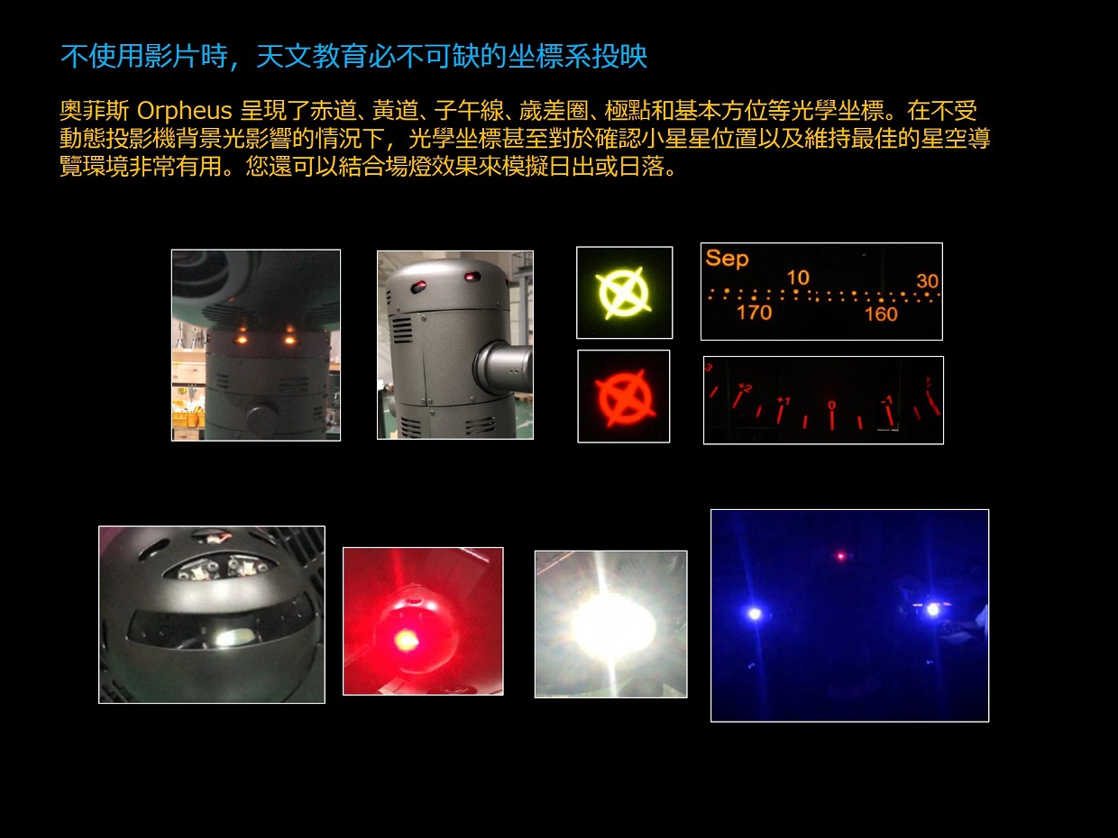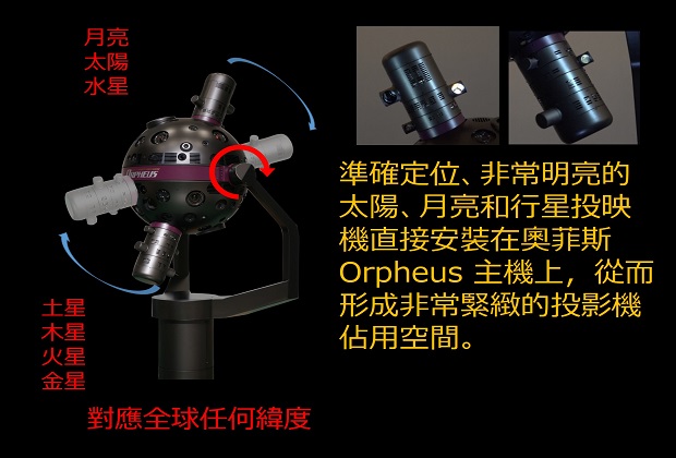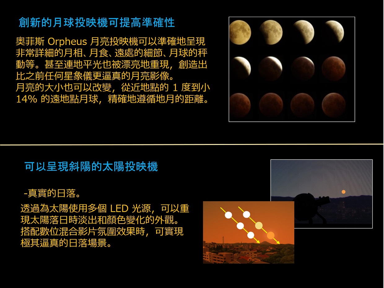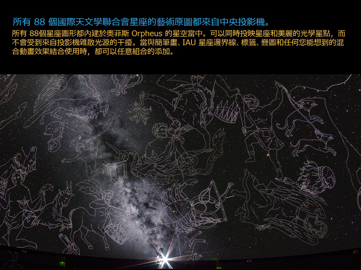 奧菲斯 Orpheus 不僅創造了“細緻而美麗的星空”,還為所有88個星座投影了星座藝術原圖,並具有許多表達天文概念的功能,這些功能對於有效的星象展示極其重要;全部來自光學投影機的主機,不必使用到全天域數位影像系統。 透過運用可程式編輯的內建數位遮罩,可以投影到傾斜式的天幕上,控制地平截止線,甚至將星星投影到觀眾席上。奧菲斯 Orpheus 是一款高規格精密光學投影機,用途廣泛 —— 從教育到娛樂。 ・產生令人嘆為觀止的細緻星空和易於辨識的星座 ・實現最佳的星象館環境,擁有嶄新的星空和最低的噪音 ・多項投影功能均位於投影主機上,無“附加元件”或“外置”投影機 ・實現緊緻而時尚的設計(新設計的行星投影機和直徑 48 公分的恆星球) ・採用高亮度 LED 光源,維護成本低 ・完善的光學數位混合相容性,但無需影片即可充足的使用