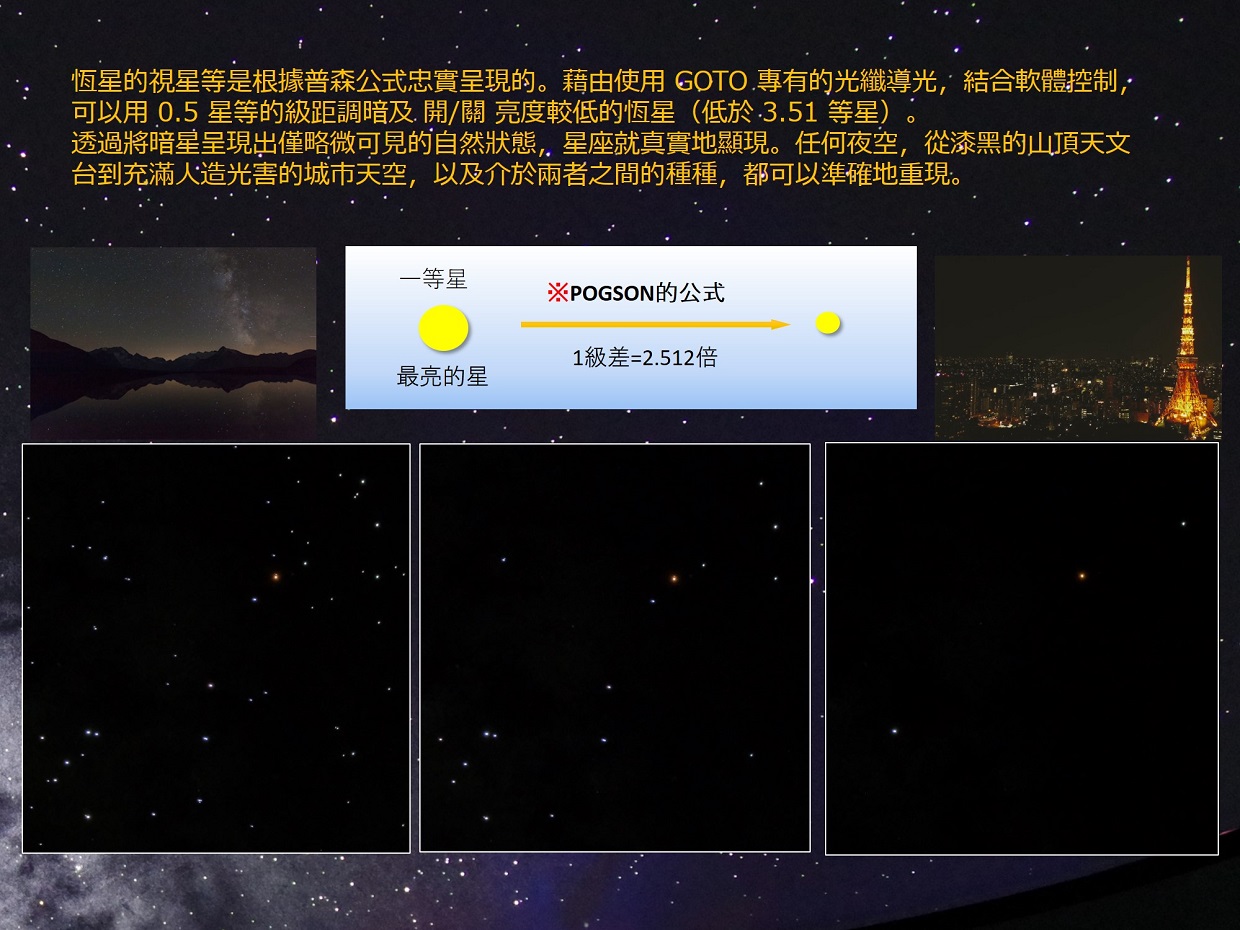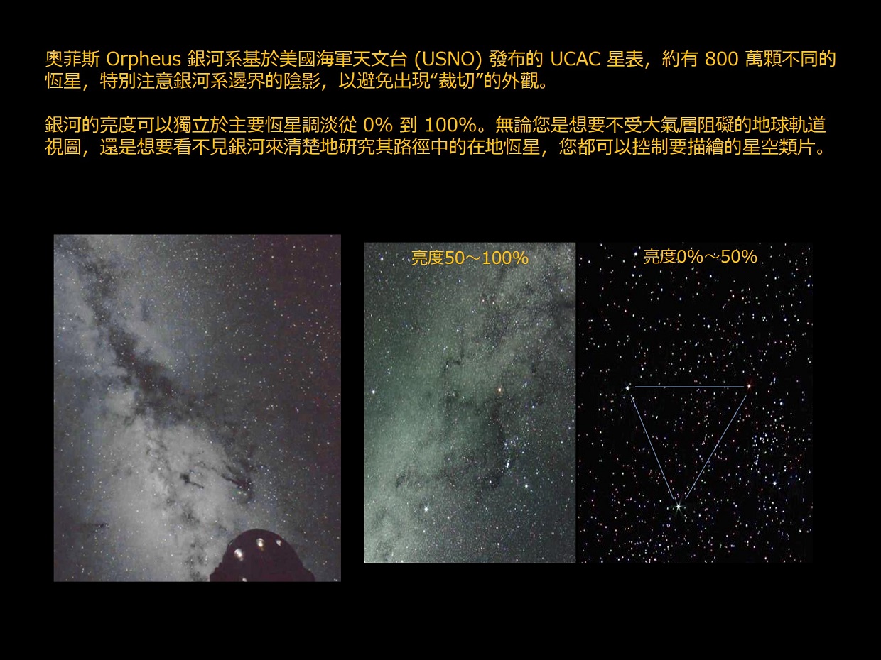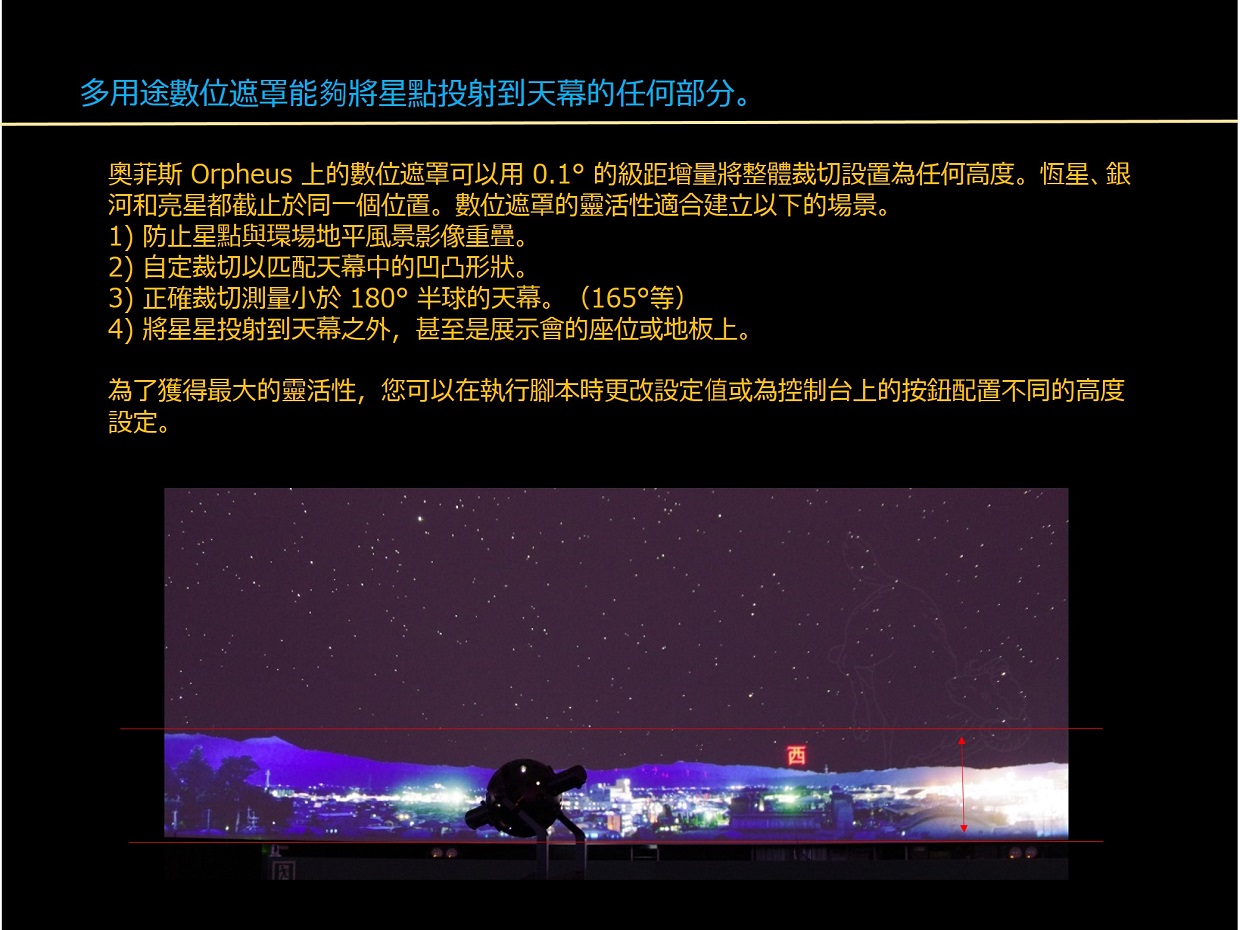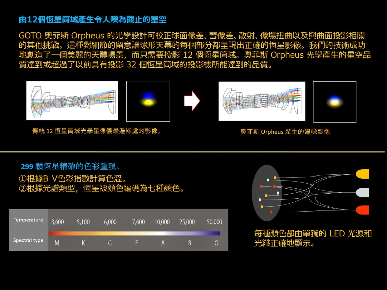 奧菲斯 Orpheus 不僅創造了“細緻而美麗的星空”,還為所有88個星座投影了星座藝術原圖,並具有許多表達天文概念的功能,這些功能對於有效的星象展示極其重要;全部來自光學投影機的主機,不必使用到全天域數位影像系統。 透過運用可程式編輯的內建數位遮罩,可以投影到傾斜式的天幕上,控制地平截止線,甚至將星星投影到觀眾席上。奧菲斯 Orpheus 是一款高規格精密光學投影機,用途廣泛 —— 從教育到娛樂。 ・產生令人嘆為觀止的細緻星空和易於辨識的星座 ・實現最佳的星象館環境,擁有嶄新的星空和最低的噪音 ・多項投影功能均位於投影主機上,無“附加元件”或“外置”投影機 ・實現緊緻而時尚的設計(新設計的行星投影機和直徑 48 公分的恆星球) ・採用高亮度 LED 光源,維護成本低 ・完善的光學數位混合相容性,但無需影片即可充足的使用